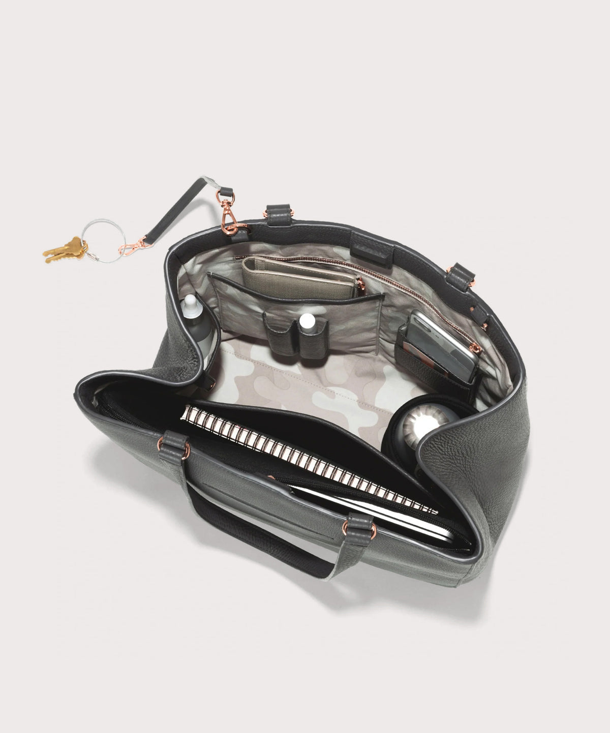 Meet the elevated upgrade to our signature tote. Inspired by late nights at the office and impromptu weekend adventures, the Allyn Tote in?dark grey?will elevate your style as fast as you can grab your phone from the exterior slip pocket. While the magnetic tab closure gives you more space when you need it, the interior snap fastener provides additional security and an alternative way to carry. A neoprene laptop sleeve and bottle holder ensure your things are always protected, while thoughtful interior pockets keep everything organized and ready to go.