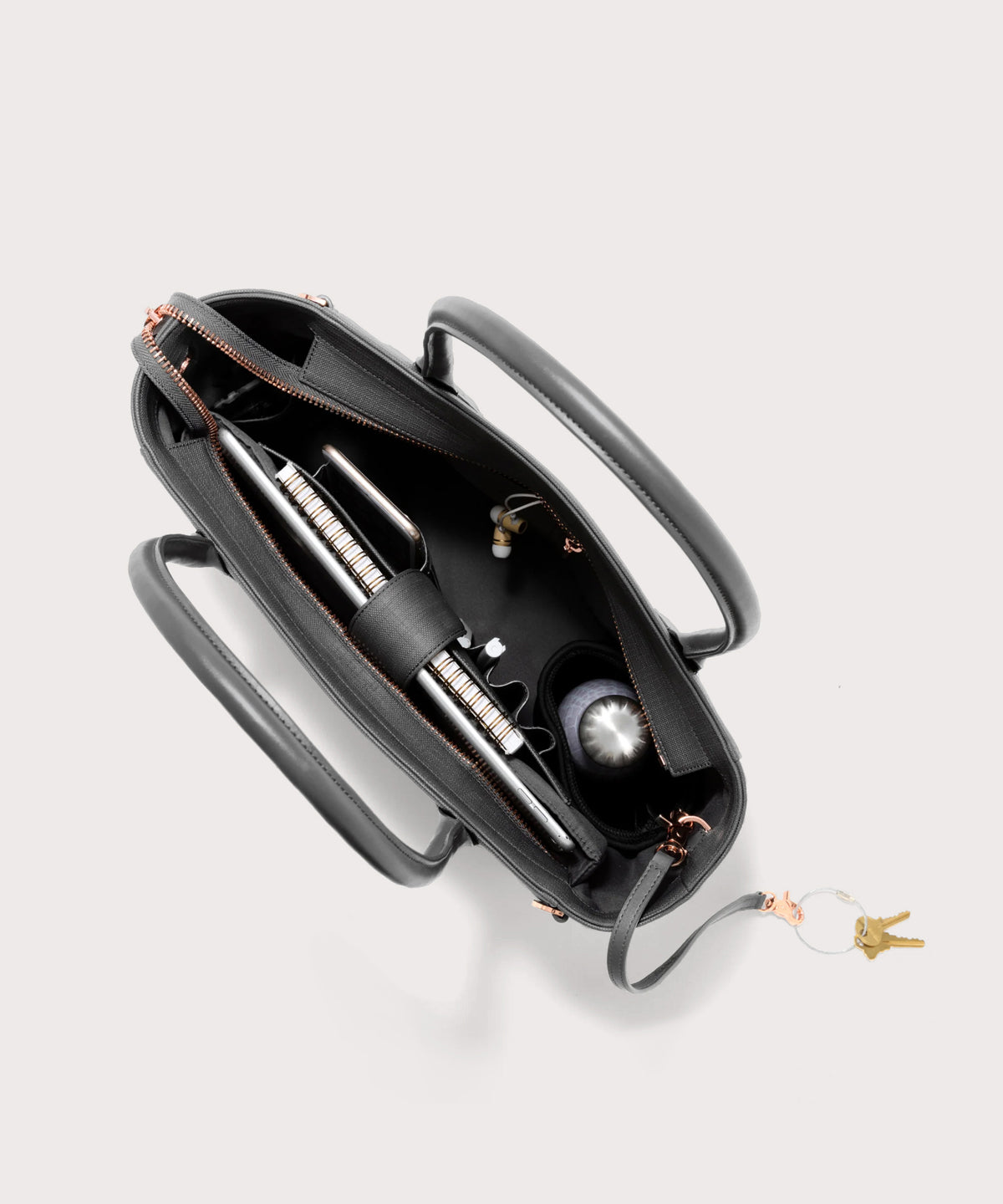 Like its full-sized counterpart, the Classic tote is made for the 7am-10pm lifestyle. It features the same clever construction but with a slimmer shape and fold-down handles for tighter situations (like balanced on your lap for the commute or tucked under your chair for cocktails). The roomy interior includes a padded compartment with a magnetic closure to keep a 13¡± laptop or tablet safe, while pockets hold your wallet, phone, metro card and lip balm in place. Plus, a detachable key leash keeps keys easily accessible and an oversized, brushed metal zipper allows you to effortlessly open and close your bag.